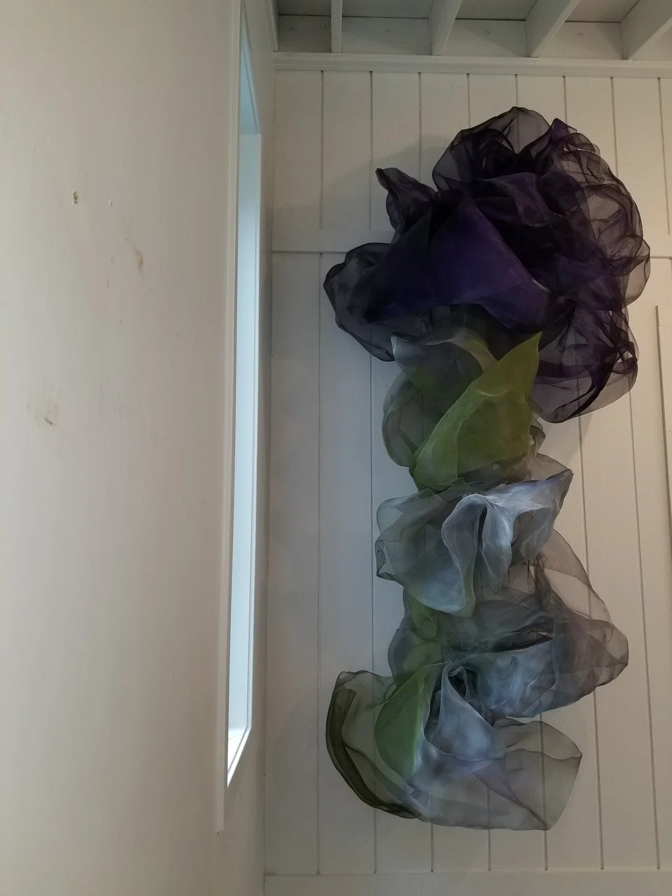 Each participant will be invited to “sign their work” by adding their name to a large board that will be posted near the completed large sculpture. I intend to create a minimum of 25 Shocking blue screening pods of various random sizes and shapes. The sheets of aluminum screening will be painted by myself off site beforehand using outdoor acrylic paint. Emphasis is on the action of our hands and noticing the evolving shapes. Participants’ silver foil pods will be inserted inside my blue screening pods, creating a contrast of color, texture and dimension. If the site permits, I will add lengths of ½” plastic tubing, painted the same Shocking Blue, to the completed sculpture, as if they are roots or tenticles, which may wrap around trees or be strung overhead. The addition of this tubing is experimental and may help to create a story that stimulates the viewers’ imaginations. The 'completed' pods may be joined together to form one large amorphic sculpture, depending on the site, or may be randomly hung or staked into the ground throughout the park. My goal is to create a wow factor as the Shocking Blue will contrast with the park foliage and/or the concrete paving in the park areas. Solar lighting may be added on Day #2. The entire process will focus on fun, experimentation and comradery.