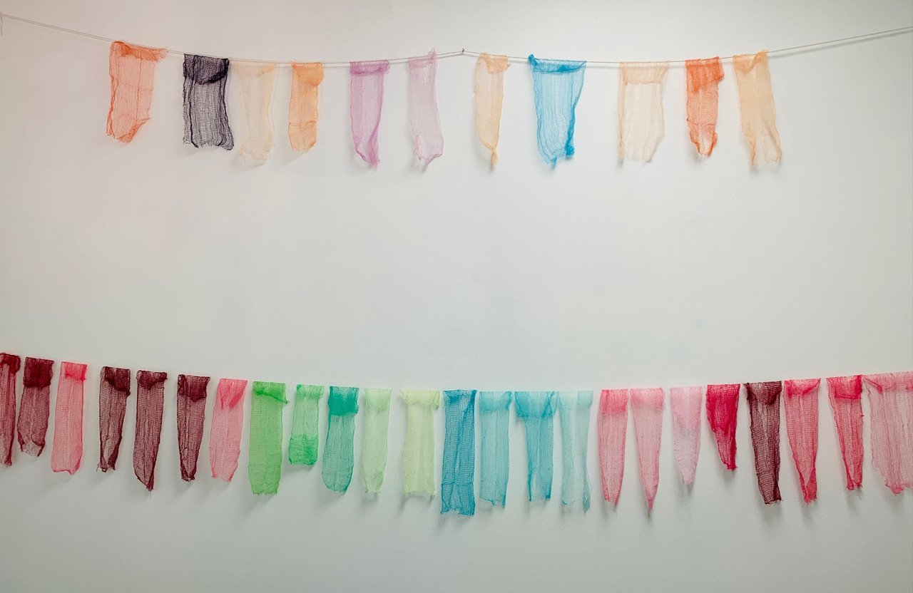 The dyed gauze has become an incredible material in my practice. The way the fiber takes the color is fantastic, and I love the beauty of the gauze unfurled as it dries. I am still exploring the dyed gauze itself as a material to be layered into two-dimensional compositions, similar to the paintings I have been making. I also like them as groups of objects strung together, and I have been experimenting using thin wire to support them. For Art in the Open, I will dye thousands of gauze pieces. I imagine creating ways to hang the gauze to dry, both with structures I bring and using what suggests itself from the site where I work. I envision a riot of color, moving with the wind, growing each day. I will have dye and gauze available for people to try out the process for themselves as well. After the event, I anticipate layering and framing some of what is created, as well as creating an installation.