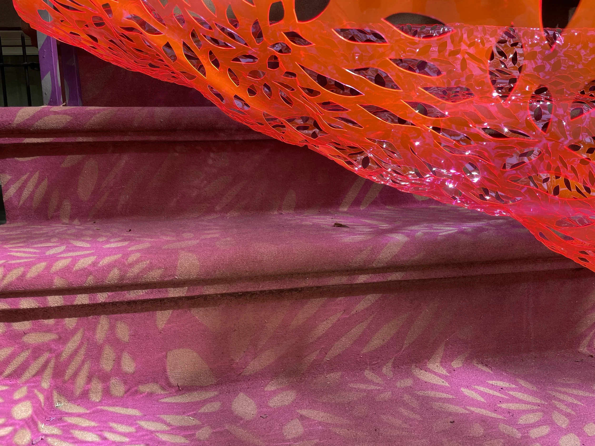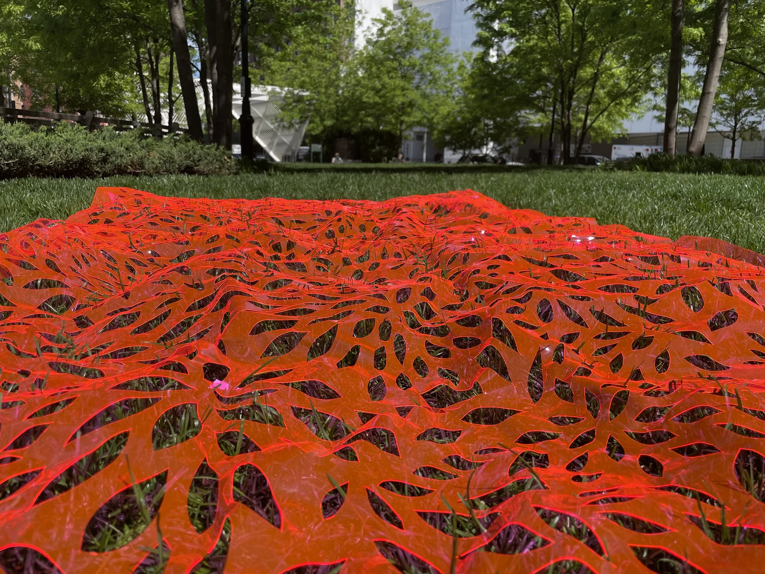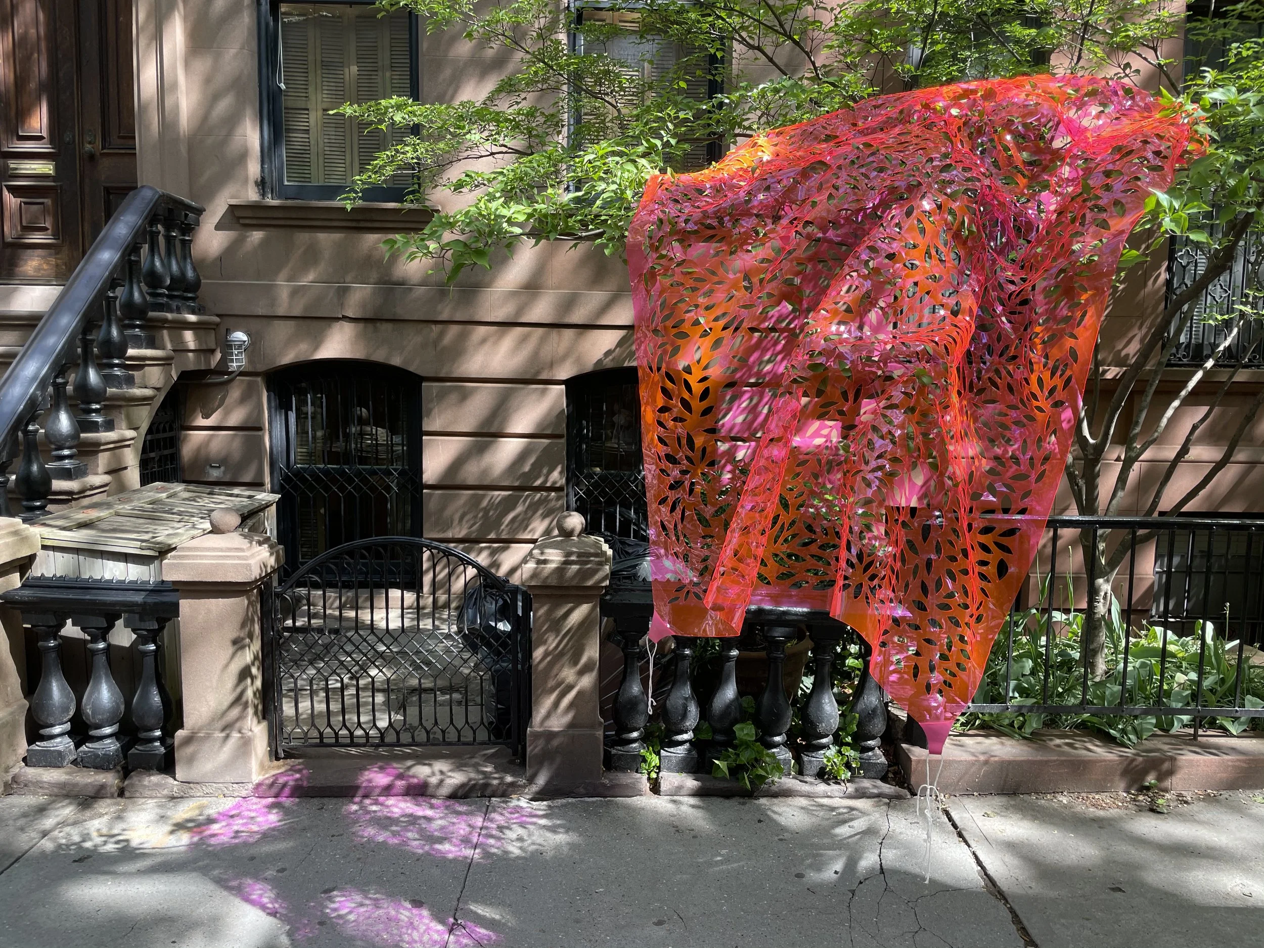 I have spent years meticulously cutting designs into newspaper, cellophane, artist’s paper, and whatever other substrate I can get my hands on. Through this meditative process, I am producing delicate structures that question what we value in society. After yearning to create outdoor work, I recently created a pane of hot pink, transparent, cut vinyl that is weather resistant. The final piece is malleable and measures 9’ x 15’ and can be hung in a variety of ways by a durable border attached at regular intervals throughout the piece. Its transparent nature allows the light to stream through it and project pink on everything it touches. Over the course of Art in the Open, I plan on hanging and rehanging this piece twice daily. Each iteration will be dictated by the reaction of pedestrians and will consider how people are interacting with the piece. For example, one iteration can be hung in a spiral for people to walk through, a la Richard Serra’s Torqued Ellipses. In another iteration, the piece may be hung as if it is a wall, and people can look through the cuts and see each other. I am not working only with a physical object but creating a performance of continued manual labor by taking it apart and putting it back up. This work is changing and growing, and by listening to the viewers, it will reinforce the importance of community input in our public spaces. In the times when I am not assembling and reassembling the piece, I will be cutting the same pattern into playing cards, plastic bags from the bodega, local newspapers, and other bits of ephemera to commemorate the occasion and sell to passersby.