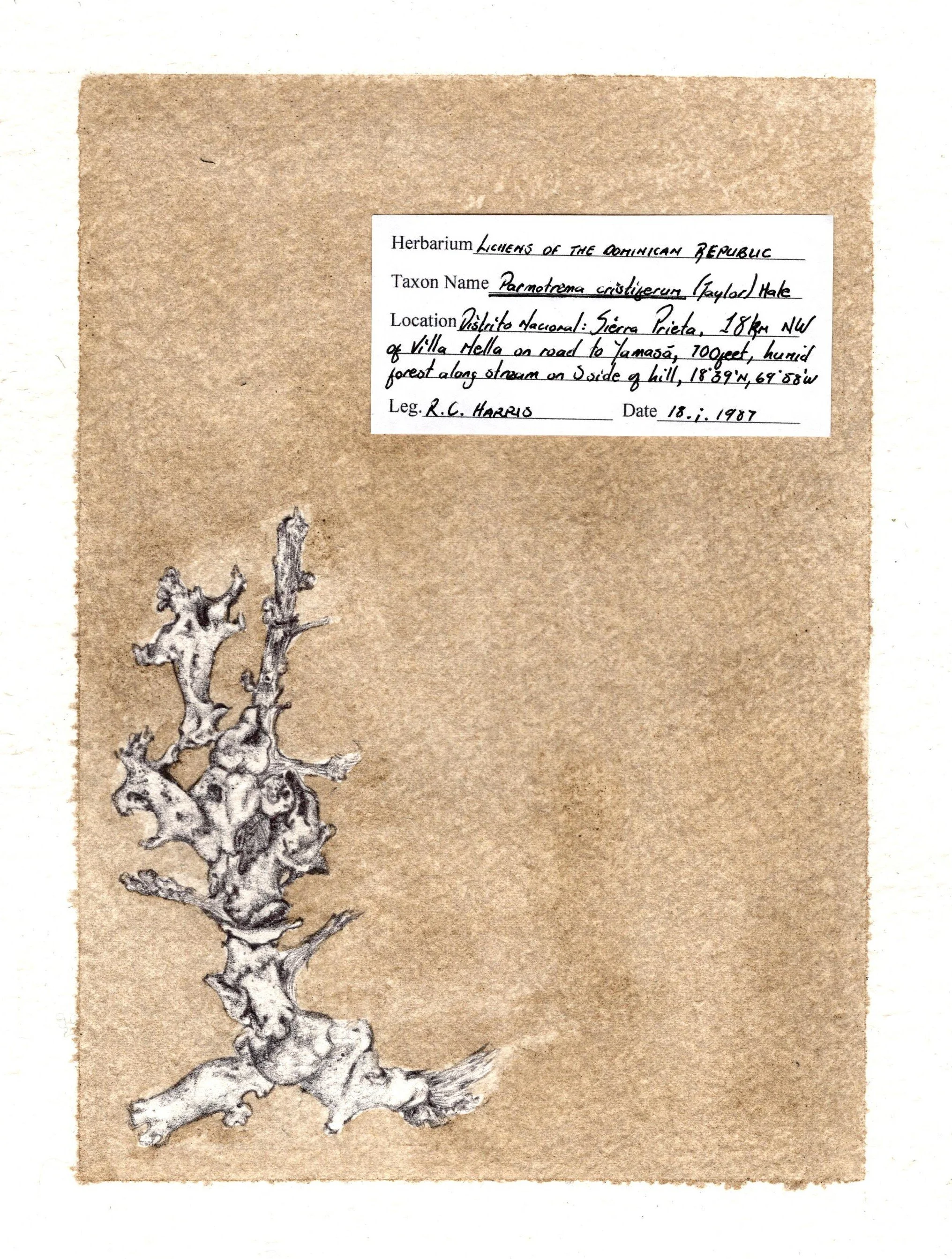 This research delves into the significance of soil, ivhu, and the project is a visual representation of my field notes. Rondo is the type of soil, in all its different colours, that I managed to grind up and turn into a watercolour paint from foraged rocks. The lichens represent one of the many different ways rocky surfaces start to get broken down, as they are among early succession plants, into the soils we see today. These lichens are Lichens of the West Indies from the New York Botanical Garden’s online herbarium collection.