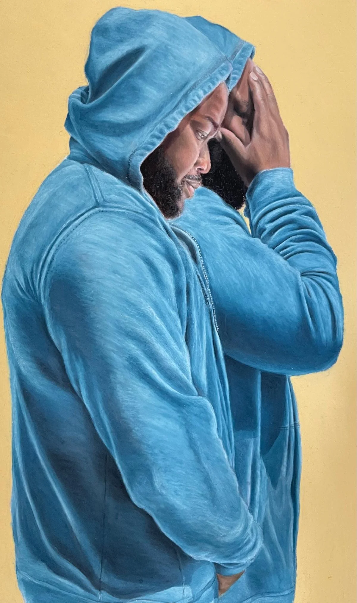 The Periphery series, composed of oil pastels, addresses the marginalization of black individuals. The subjects, depicted wearing hoodies, serve as a commentary on the negative stereotypes that often obscure the full humanity of black people. The body language and poses of the subjects reflect an introspective examination of existing in unwelcome spaces, with emotions ranging from nervousness to resignation.